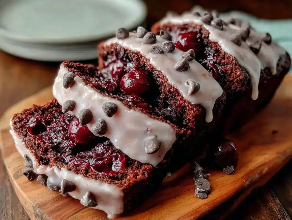 Serve this Black Forest Chocolate Chip Loaf Cake at room temperature for the best texture—the chocolate chips stay slightly gooey, and the cherry glaze remains luscious. For a fancier presentation, sprinkle extra chocolate chips and whole cherries over the top, and slice thick for maximum impact.