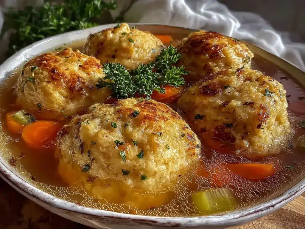 A warm, savory matzo ball soup with fluffy matzo balls and homemade chicken broth, perfect for cozy family meals and comforting dinners.