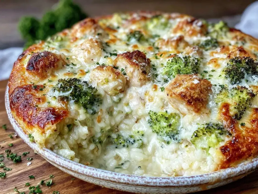 A cozy and creamy casserole combining tender chicken, vibrant broccoli, and creamy rice topped with a crispy golden crust. Perfect for quick, comforting weeknight dinners.